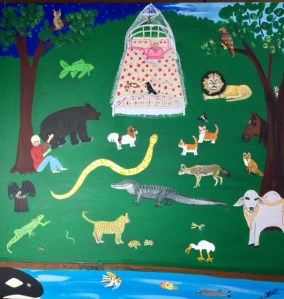 Recently I found the feather of a great horned owl! I was thrilled and then doubly so, when, the very next day I found a 2nd feather from a great horned owl. I looked in my book called “Animal Speak” which talks about the power of feathers and it said that if you hang two great horned owl feathers and the feather from a red-tailed hawk over your bed, it will bring lucid dreaming. I told this to a dear friend and she mailed me the feather from a red-tailed hawk! The images in this painting are of me sleeping and the many animals that have come to me in my dreams for paintings. That is also me, holding a paintbrush, sitting under a tree enjoying the menagerie.