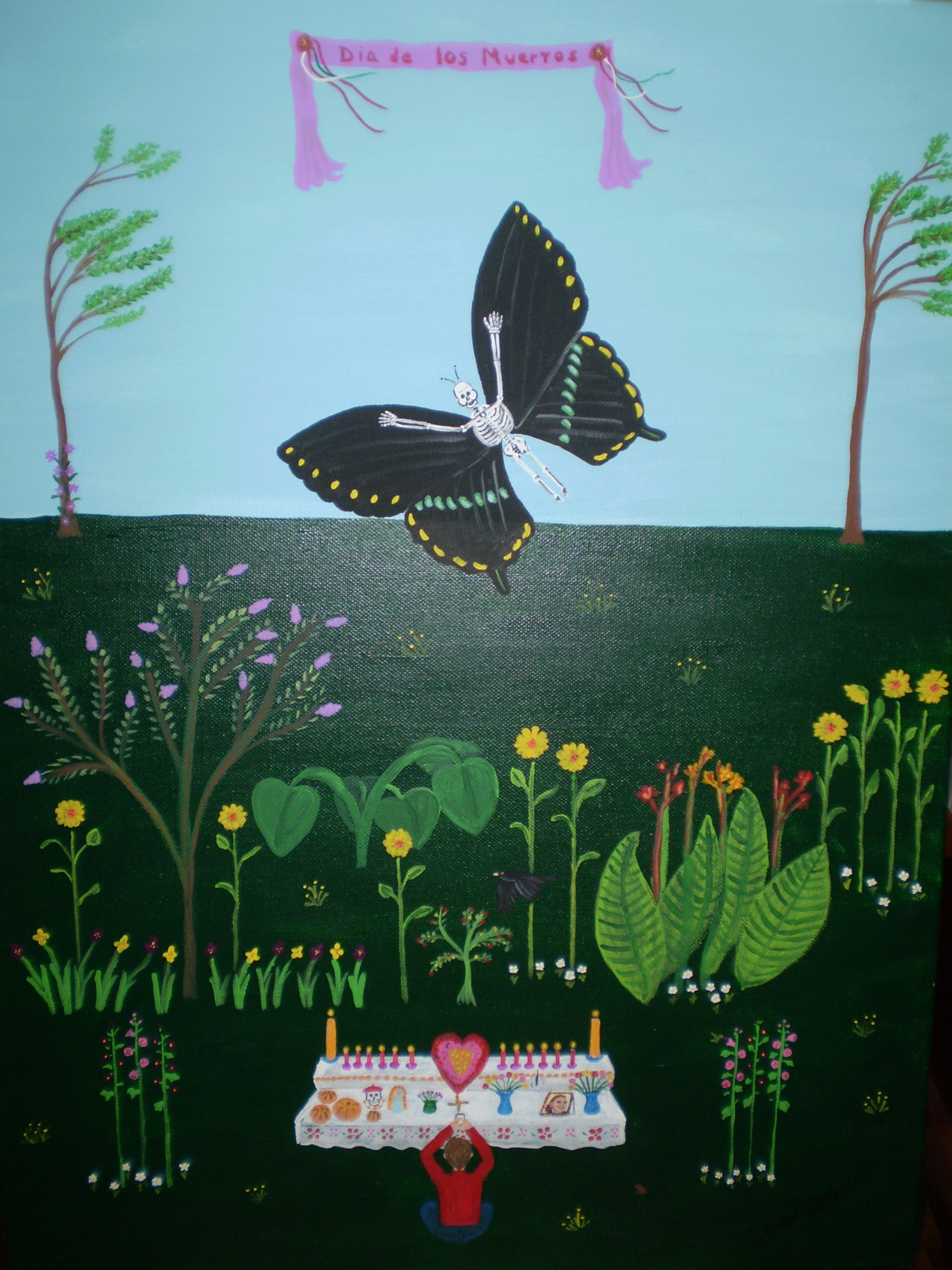 Shortly after my niece died, a black butterfly showed up in my yard. It followed me as I moved from garden bed to garden bed and was with me for several days. I asked, “Is that you, Mira?” as I had had other experiences in nature that I felt were connected to her spirit. I chose the Mexican tradition of celebrating Dia de los Muertas to honor, remember, and welcome her spirit. On their altars, they include four elements: Earth (represented by crops,) Wind (represented by a moving object – note the feather dropping from the crow,) Water (I am offering her spirit water in a glass,) and Fire (candles lit in her honor.) Brigid’s cross is on the altar…. A crow actually did drop a feather next to me during this week of the butterfly interactions.
