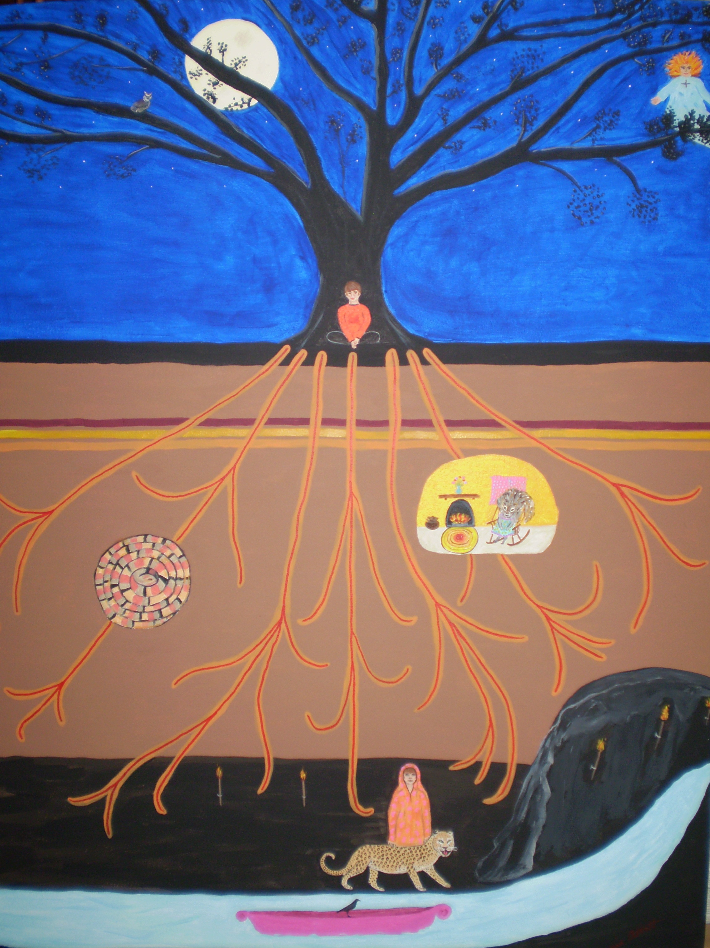 This painting represents my process when I was in a writing group and was guided into meditation. I always became a squirrel who fluffed out her tail and sat in a rocker in a cozy den. When asked to go deeper, I became the figure at the bottom of the painting with a leopard about to board the boat to go down into the bowels of the earth. Brigid watches over me, as always. The owl is a symbol of the magic that was a part of the writing group.