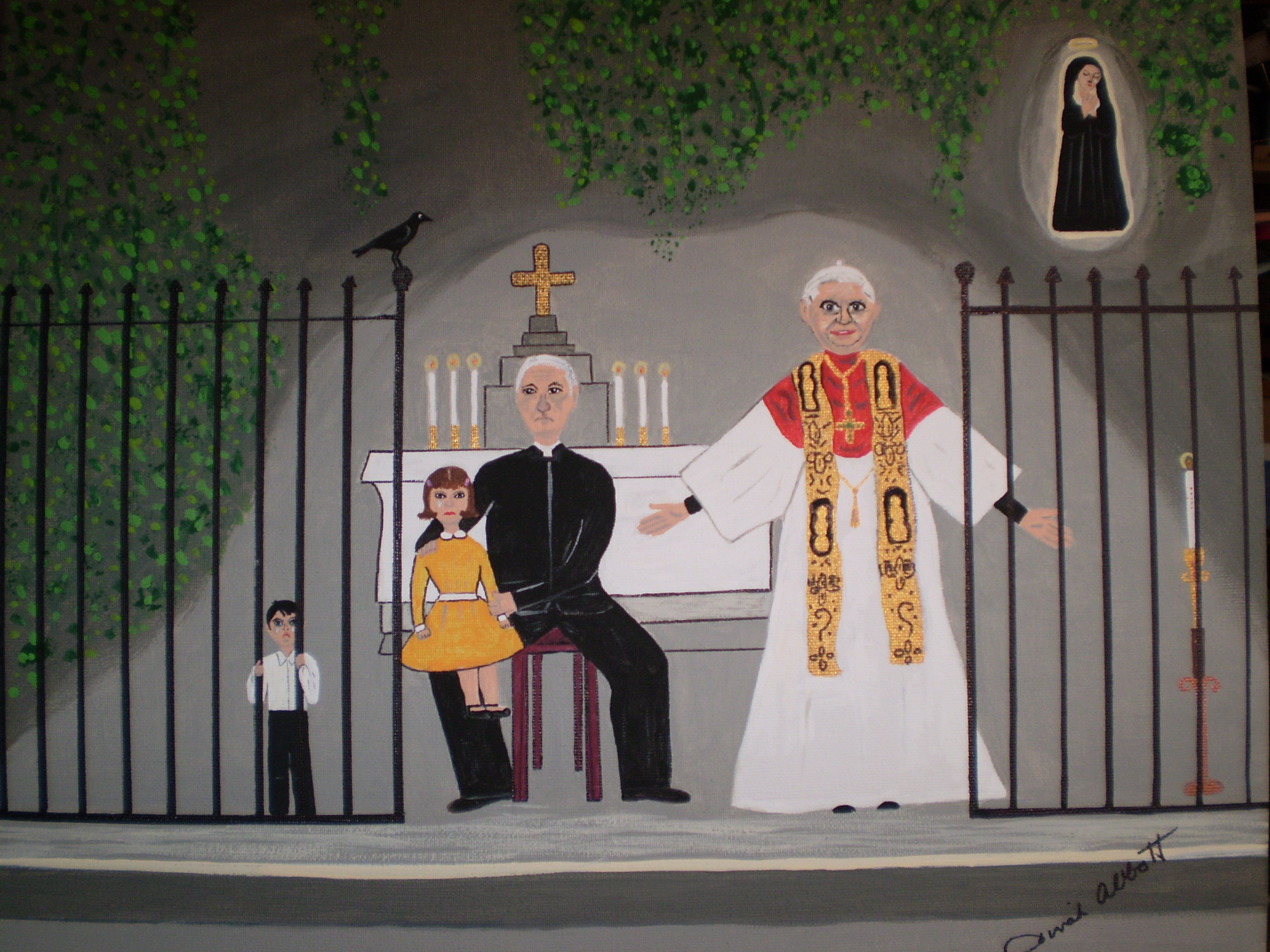 The movie “Deliver Us From Evil” prompted the painting below. It is a painting of Pope Benedict protecting Father Oliver O’Grady (self-proclaimed pedophile and rapist of many children) in the papal grotto in Vatican City.
