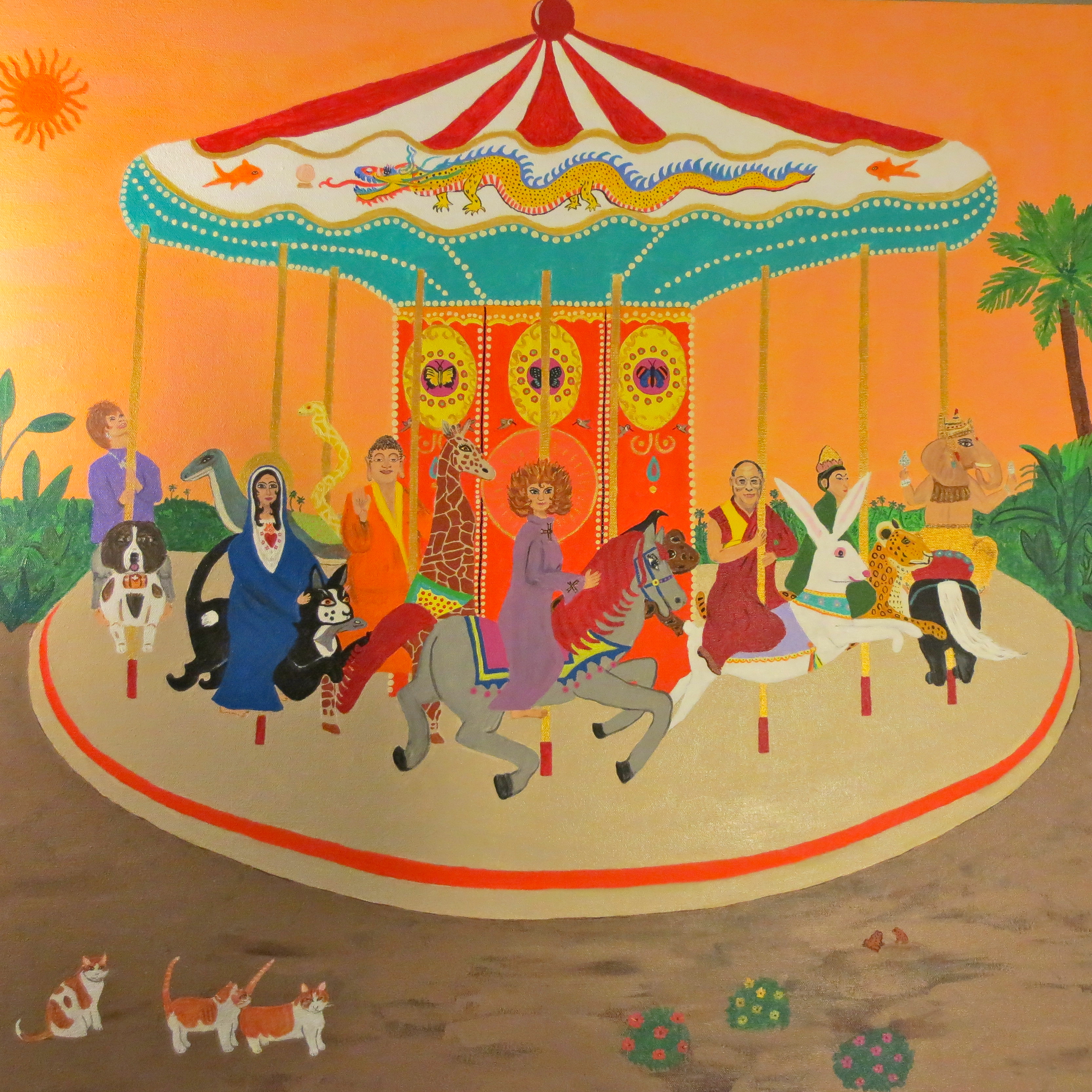 This is a painting of a dream I had of the spiritual beings who affect my life, riding with me on the carousel of life. I added the St. Bernard at the request of my precious granddaughter, Ella. And my three cats, Harry, Angel Pie and Leo look on….as well as beloved toads.